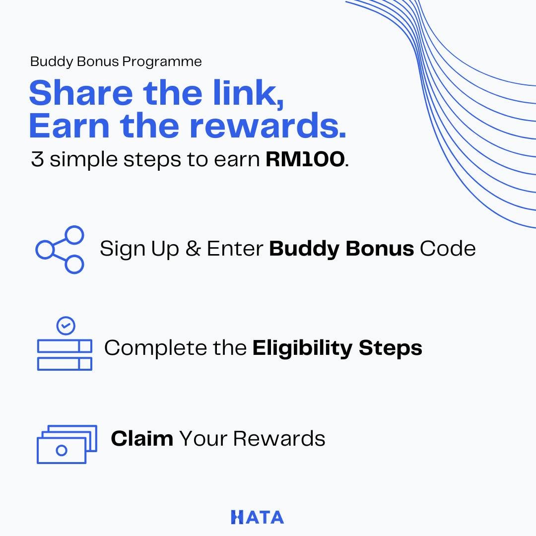 Hata’s Buddy Bonus Programme is designed to reward users who successfully invite others to sign on to their platform. When you invite someone to join Hata using your unique referral link, both you and your referee can earn up to RM50 each after completing a few simple steps.