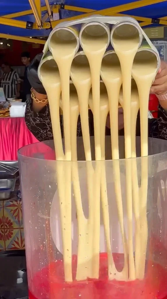 After pouring in the concentrated strawberry juice, the vendor poured in 10 cans of condensed milk, but the sweetness did not end there. The addition of the condensed milk visually “alters” the drink, but here comes more sweetness.