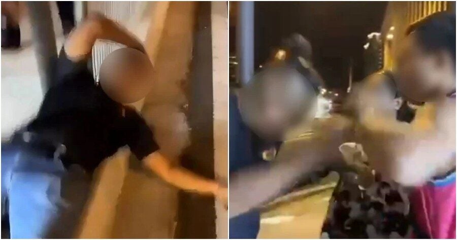 2 men engaged in a physical fight on the pedestrian walkway outside a condominium in Selangor recently.