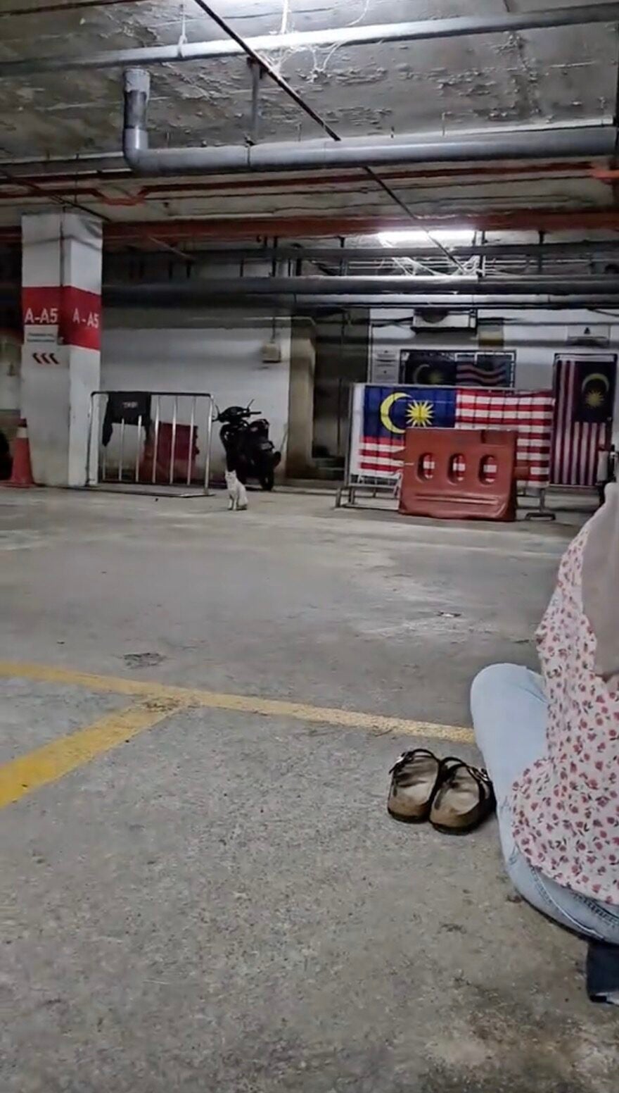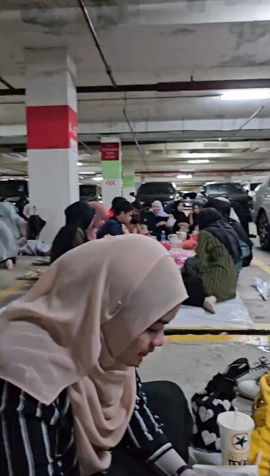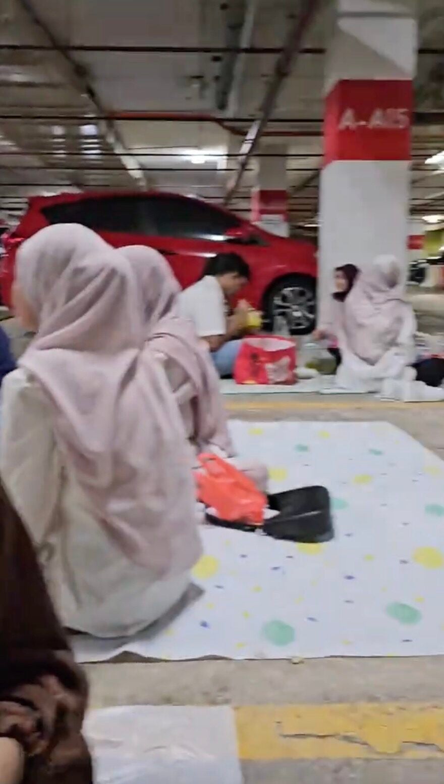 In the video, several groups of individuals can be seen putting mats on the floor of an indoor car park at an undisclosed location while enjoying their buka puasa feast.