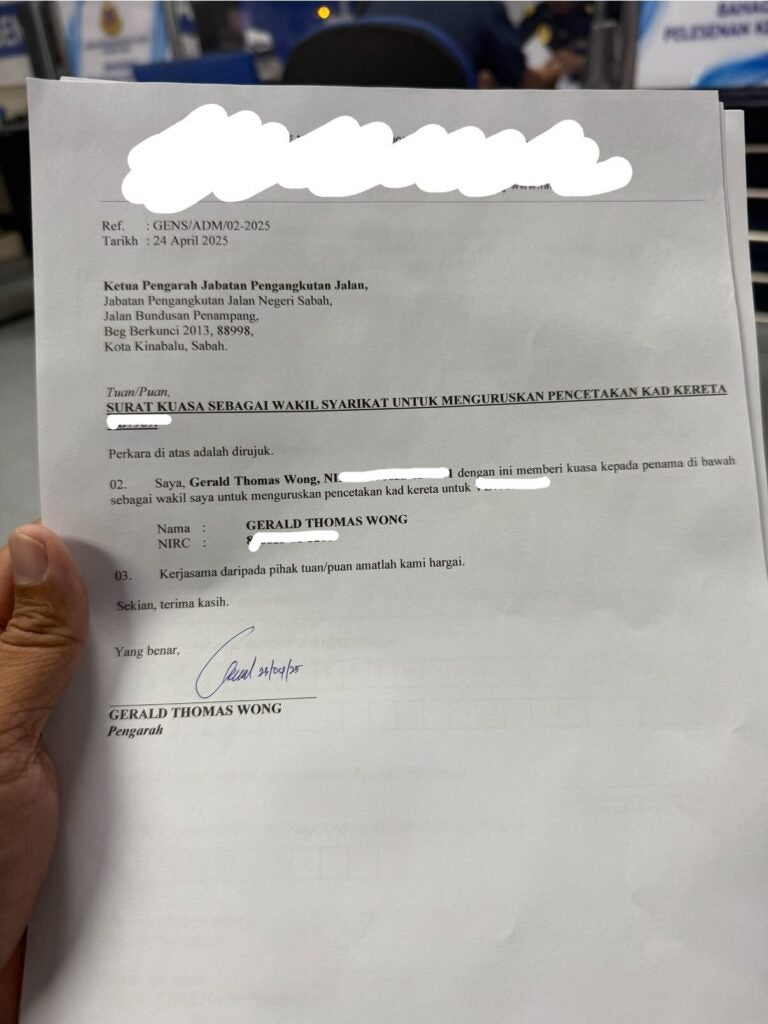 He shared, “The stupidest letter I have ever written so far. I was asked to write a letter to give MYSELF permission to reprint MY vehicle grant at JPJ Bundusan (Sabah). I attached my trading license, which said the company was in my name and my identity card number, but the officer responded, ‘Anyone can make a trading license, I also have a company and a trading license, how do I know this trading license is really yours?‘.”