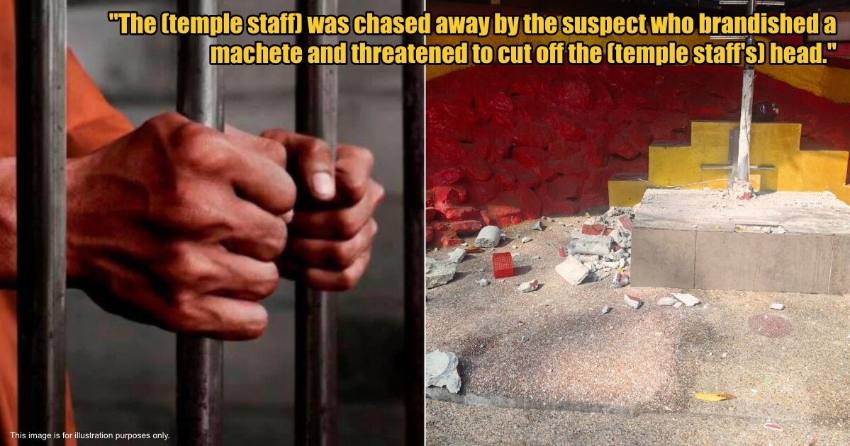Later, the suspect entered the temple again while carrying a hammer, an iron cutter, a machete and a keris, before the suspect started breaking and damaging the Sullam (Hindu structure of worship).