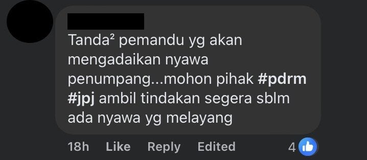 “The signs of a driver who will risk the lives of the passengers. I hope that the Royal Malaysia Police (PDRM) and the Road Transport Department (JPJ) will take action before lives are lost.”