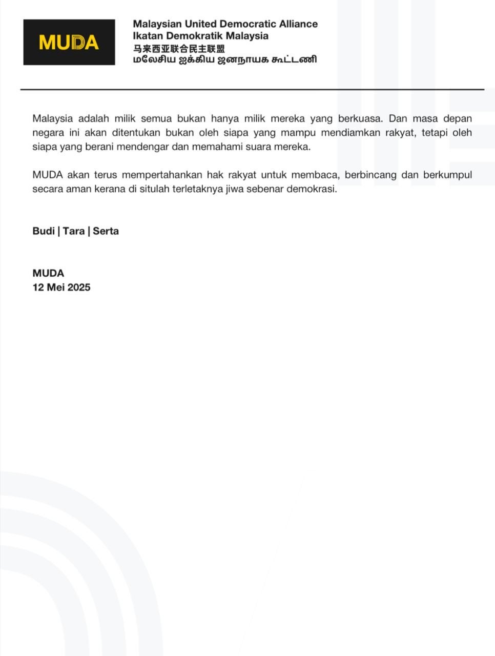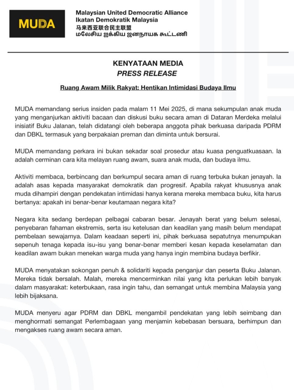 The Malaysian United Democratic Alliance (MUDA) has since responded to the incident, saying the group was approached by officers from both PDRM and DBKL (including those in uniform) during their reading session at Dataran Merdeka.