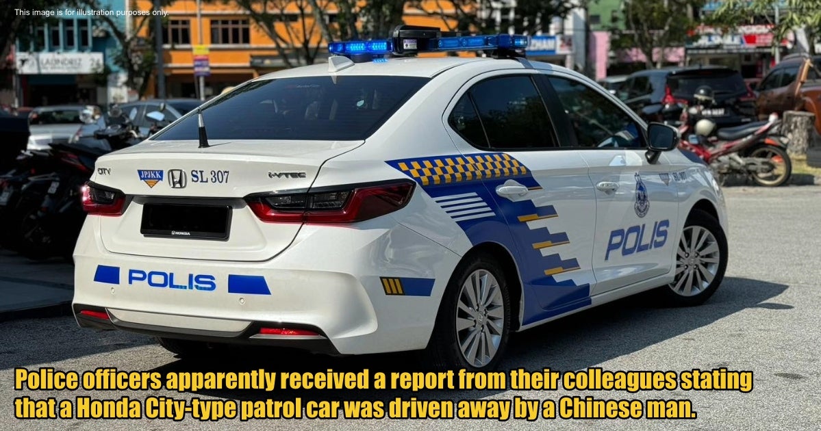It is understood that police officers on duty at the Klang Selatan District Police Headquarters received a report from 2 of their colleagues, stating that a Chinese man drove away a Honda City-type patrol car.