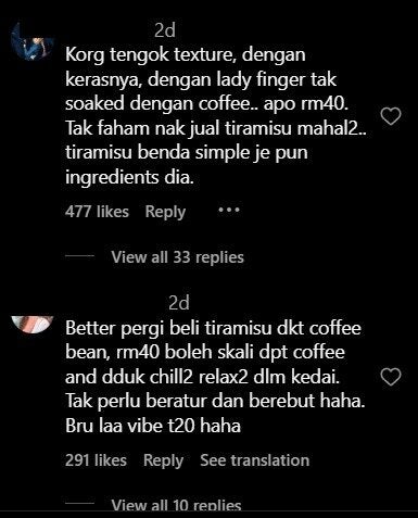 “Look at the texture, it looks hard, and the lady’s fingers are barely soaked in coffee. RM40 for that? It’s a simple dessert. Why would she sell it at that price?”