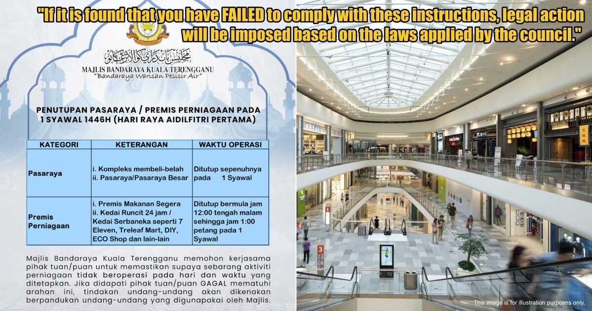 The Kuala Terengganu City Council (MBKT) has ordered all supermarkets, hypermarkets and shopping malls to close for the first day of Hari Raya (Monday, March 31).