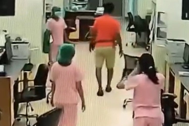 In a security camera video, the man, wearing an orange T-shirt and shorts, was seen talking to the nurses before suddenly slapping one of them twice. He even tried a third time but missed.