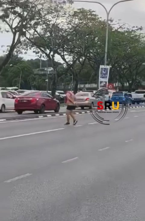 In several videos shared on the Sarawak Roads Update Facebook page which have gone viral, the man was spotted wearing only his underwear as he walked across a busy road full of traffic.