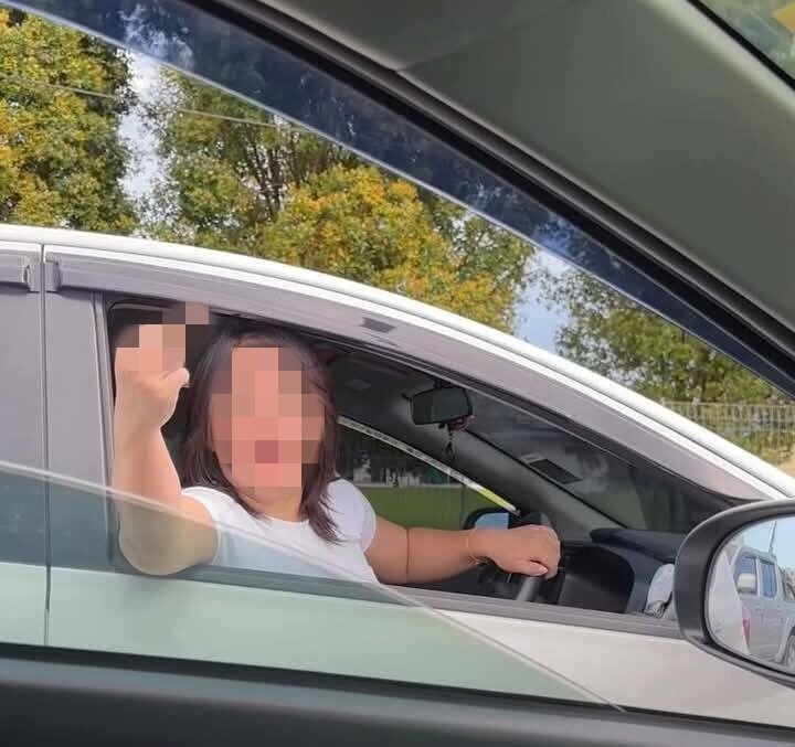 When the woman took over the man, she “proudly” raised her hand out the window and pointed the lewd gesture again.